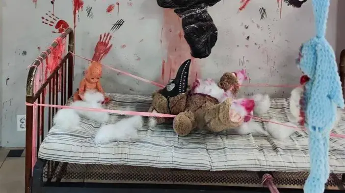 Креативные сотрудники центра не ограничились одной деталью: помещение было трансформировано в настоящий «замок ужаса». Интерьер украсили искусственными тыквами и паутиной, кроватью с мягкой игрушкой, стилизованной под «жертву» в маске чумного доктора, а стены покрыли алой краской, имитирующей кровь. В одном из углов можно было заметить черный пакет, туго замотанный скотчем и цепью, что добавляло достоверности происходящему.